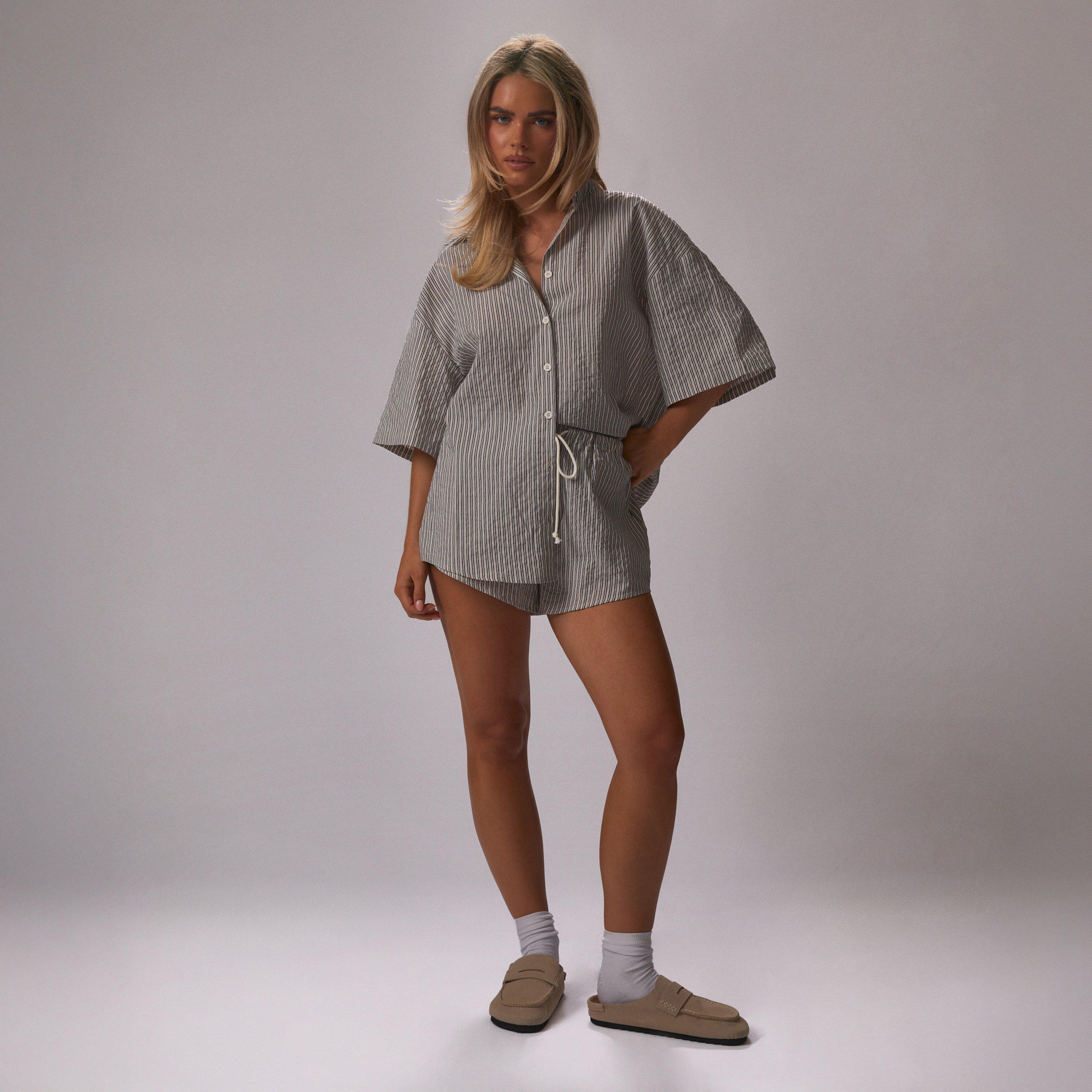 Your summer wardrobe just got an upgrade. Featuring grey stripe crinkle poplin material with drawstring waist detailing and a mini fit. Style with the matching shirt and fresh trainers for a casual-cool look that is totally on-trend.