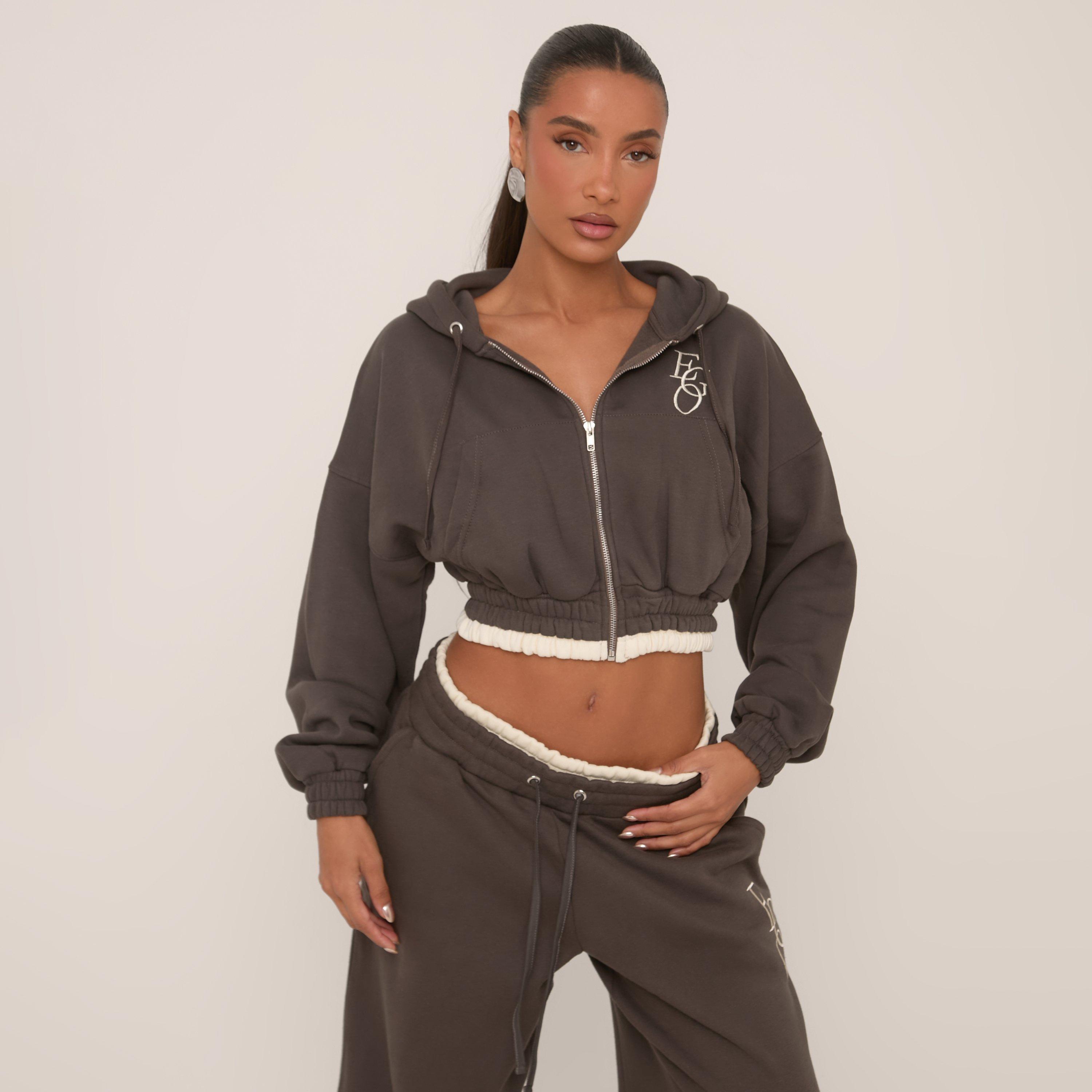 Stay cute and comfy in our Ego Graphic Contrast Hem Cropped Hoodie In Grey. This cropped grey zip up hoodieâ boasts a luxe ego graphic and edgy contrast hem. Style this cropped hoodie with the matching joggers for a laid-back look!