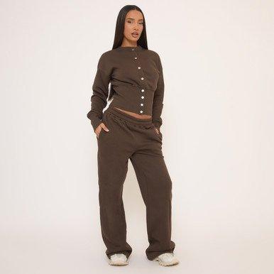 Stay comfy but stylish, doll. Featuring a brown fabric with an elasticated waist and wide-leg design, these joggers bring laid-back vibes with a touch of chic, perfect for off-duty days.