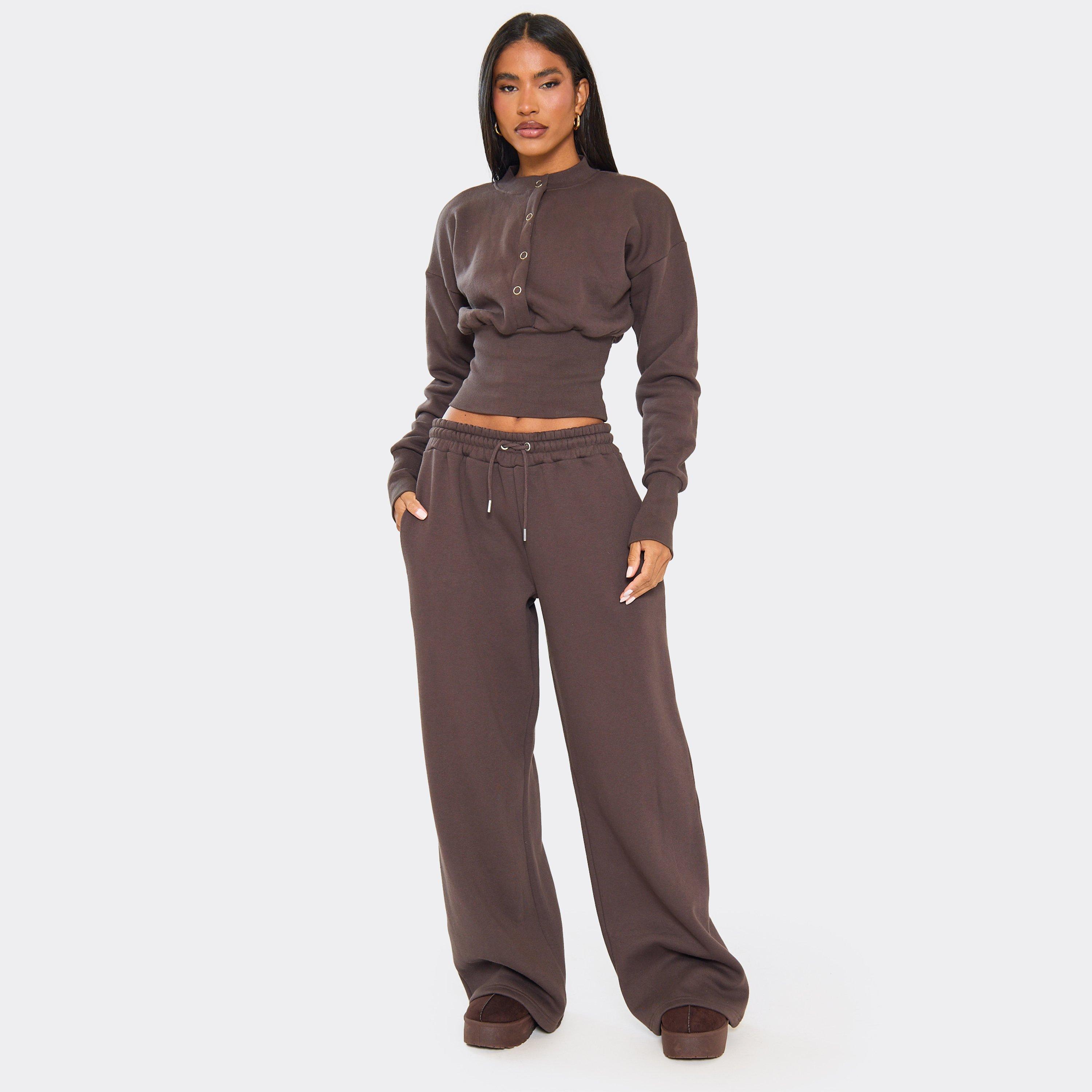 Switch up your casual rotation with these brown joggers. Effortlessly laid-back, these lounge bottoms feature an elasticated waist and a relaxed, flowing fit that’s comfortable while flattering your shape. Made from soft, stretch fabric, these joggers move with you for all-day ease. Wondering how to style wide-leg joggers? We always pair these brown joggers with their matching chocolate brown long sleeve popper detail cinched waist sweatshirt and mini boots . They’re just a need. Key Features Chocolate Brown Colour Elasticated Waist Wide-Leg Fit Soft Stretch Fabric Relaxed, Comfortable Silhouette