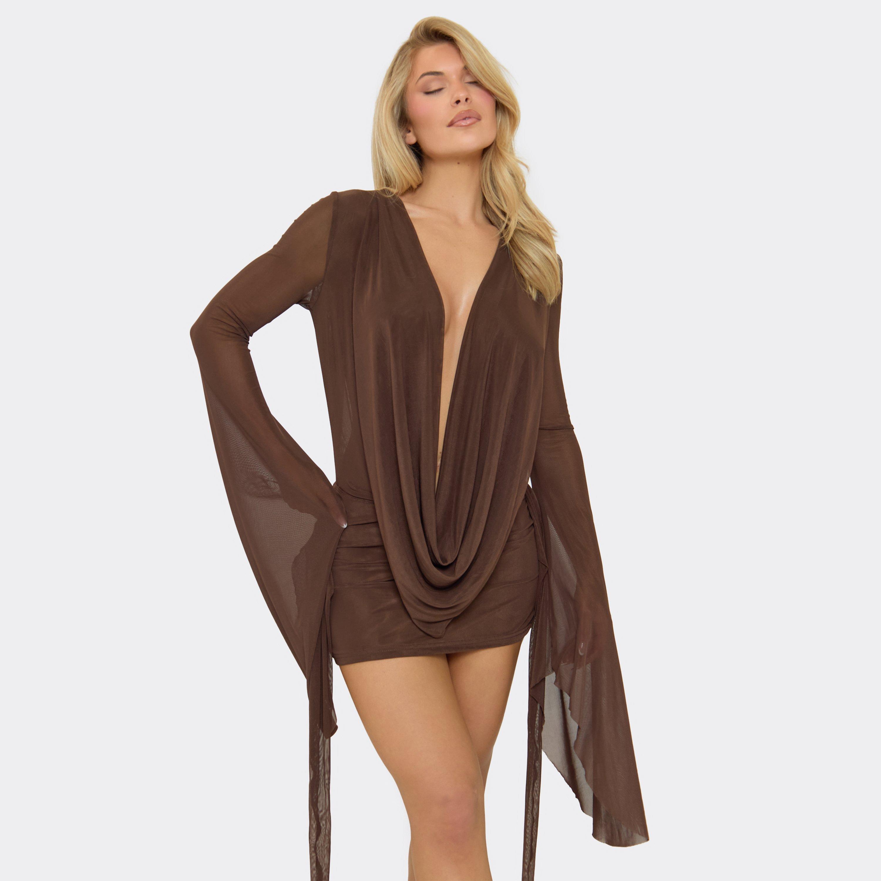 Perfect for night-out plans or statement vibes, chocolate brown fabric with exaggerated sleeves, cowl neck, and open tie-back detailing for a bold, on-trend mini fit. Style with strappy heels or ankle boots and a sleek bag for effortless it-girl energy.