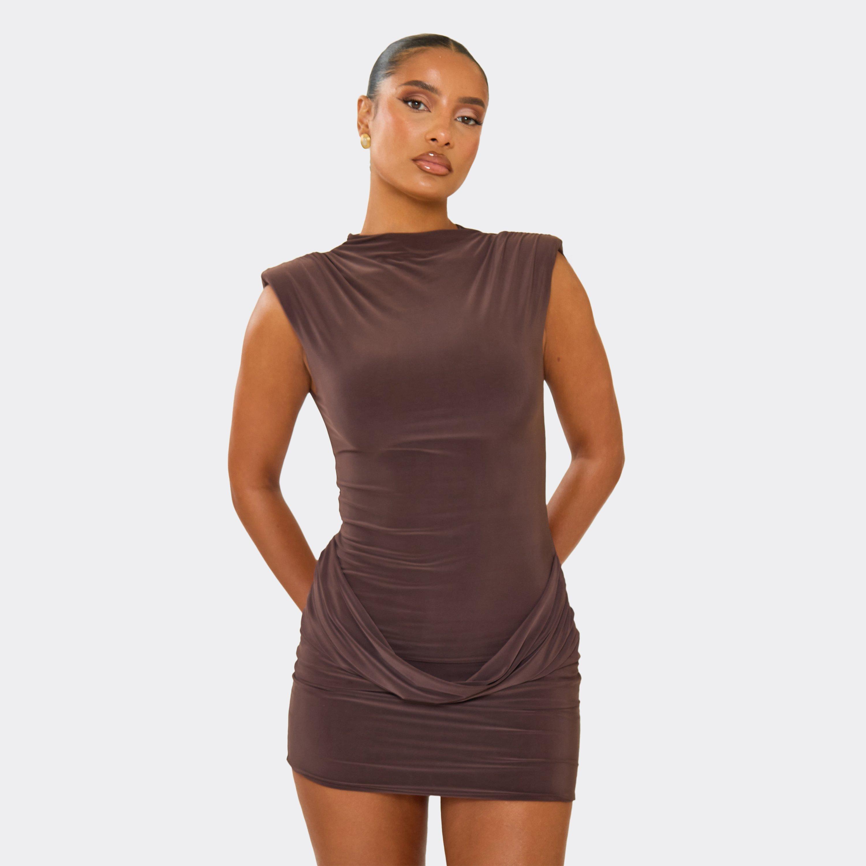 Date night or drinks with the girls, doll. Featuring chocolate brown material with draped front detailing, high neck, cap sleeves, and shoulder pads, this mini brings bold, chic energy for every after-dark moment.