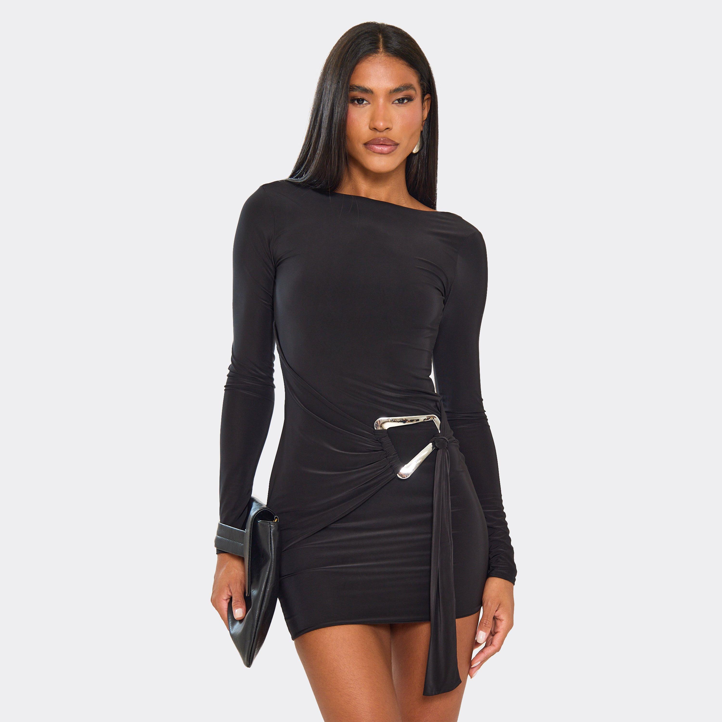 Night-out dresses can be sexy AND chic, and this black long-sleeve slinky dress is proof of that. Elegant and flattering, it features drape trim detailing and a body-skimming slinky fit for a look that’s polished yet playful. Designed with a tailored silhouette, this dress cinches at the waist and skims your shoulders for a flattering shape. Switch it up by styling this black long-sleeve slinky dress with chunky gold bracelets , your favourite hoop earrings , and clear Perspex heels . It’s a classy closet classic. Key Features Black Colour Long Sleeve Design Drape Trim Detailing Mini Length Body-Skimming Slinky Fit Tailored Fitted Silhouette