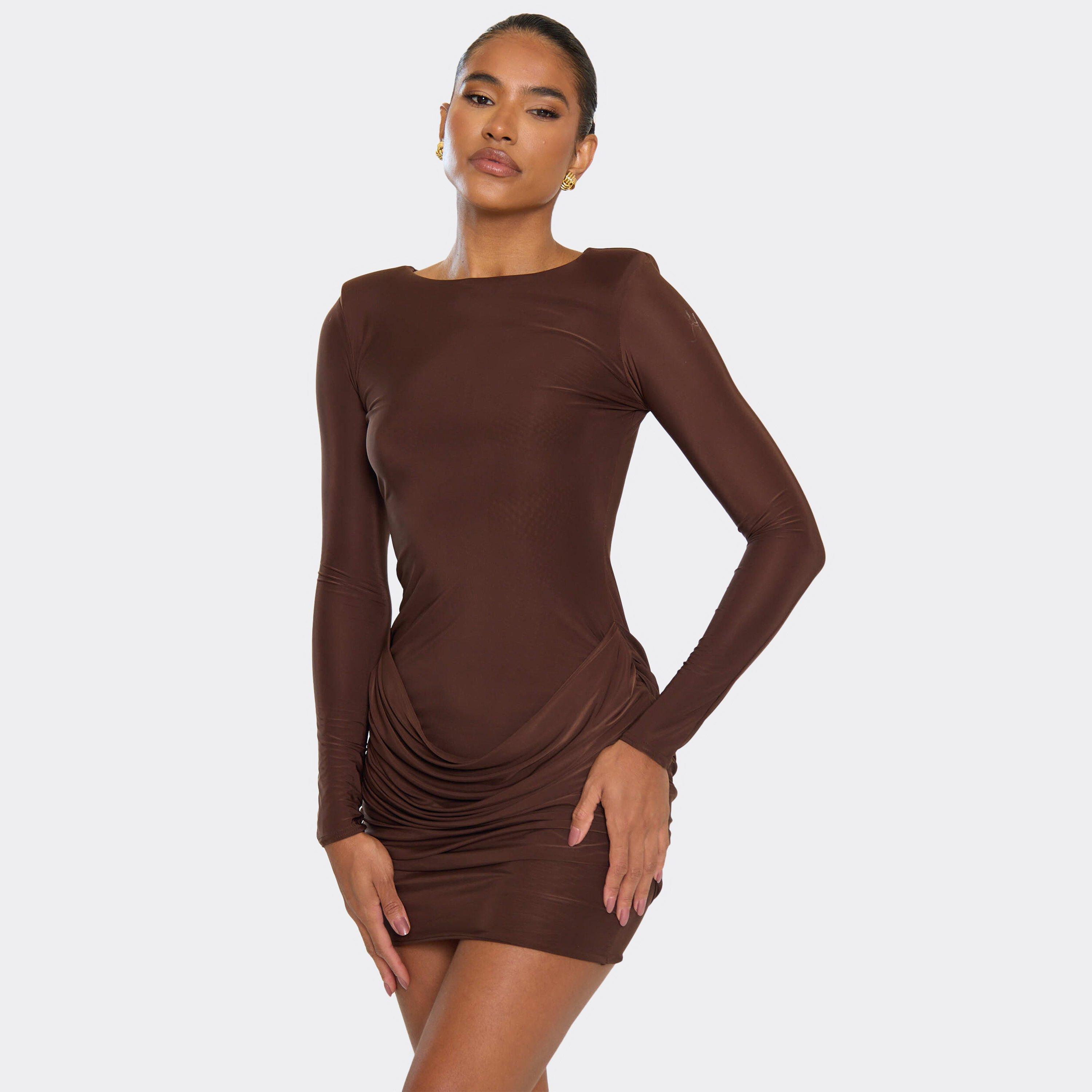 Not really feeling your date night outfit ideas? Switch them up with this long-sleeve brown mini dress. A real head-turner, this long-sleeve dress features shoulder pads to complement your figure, plus sultry front and back drape detailing. Tailored to perfection, this mini dress is made with a figure-hugging fabric in a chocolate-brown hue that sculpts your silhouette. Make this long-sleeve brown mini dress the moment by styling it with a shoulder bag , gold hoops , and thong-strap heeled mules . Yep, it’s THAT dress . Key Features Chocolate Brown Colour Stretchy Fabric Long Sleeves Mini Length Should Pads Drape Detailing Boat Neckline Bodycon Fit