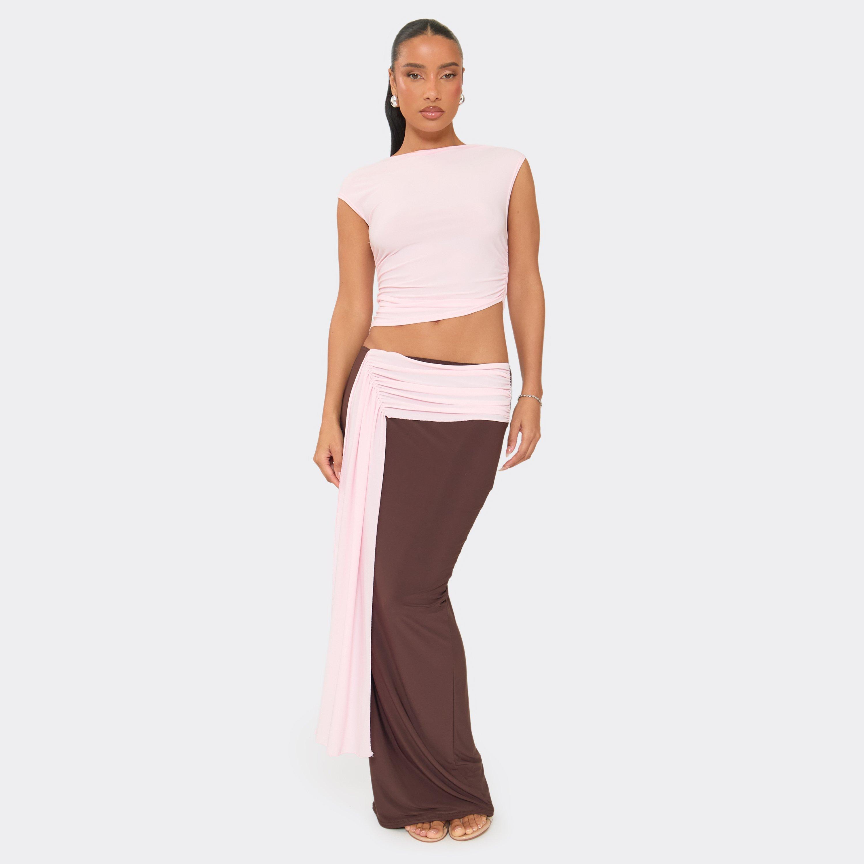 Make an entrance, doll. Featuring a chocolate brown material with a low-rise fit and contrast pink drape detailing, this maxi skirt is a total mood. Style with a matching corset top and heels for a high-end, it-girl aesthetic.