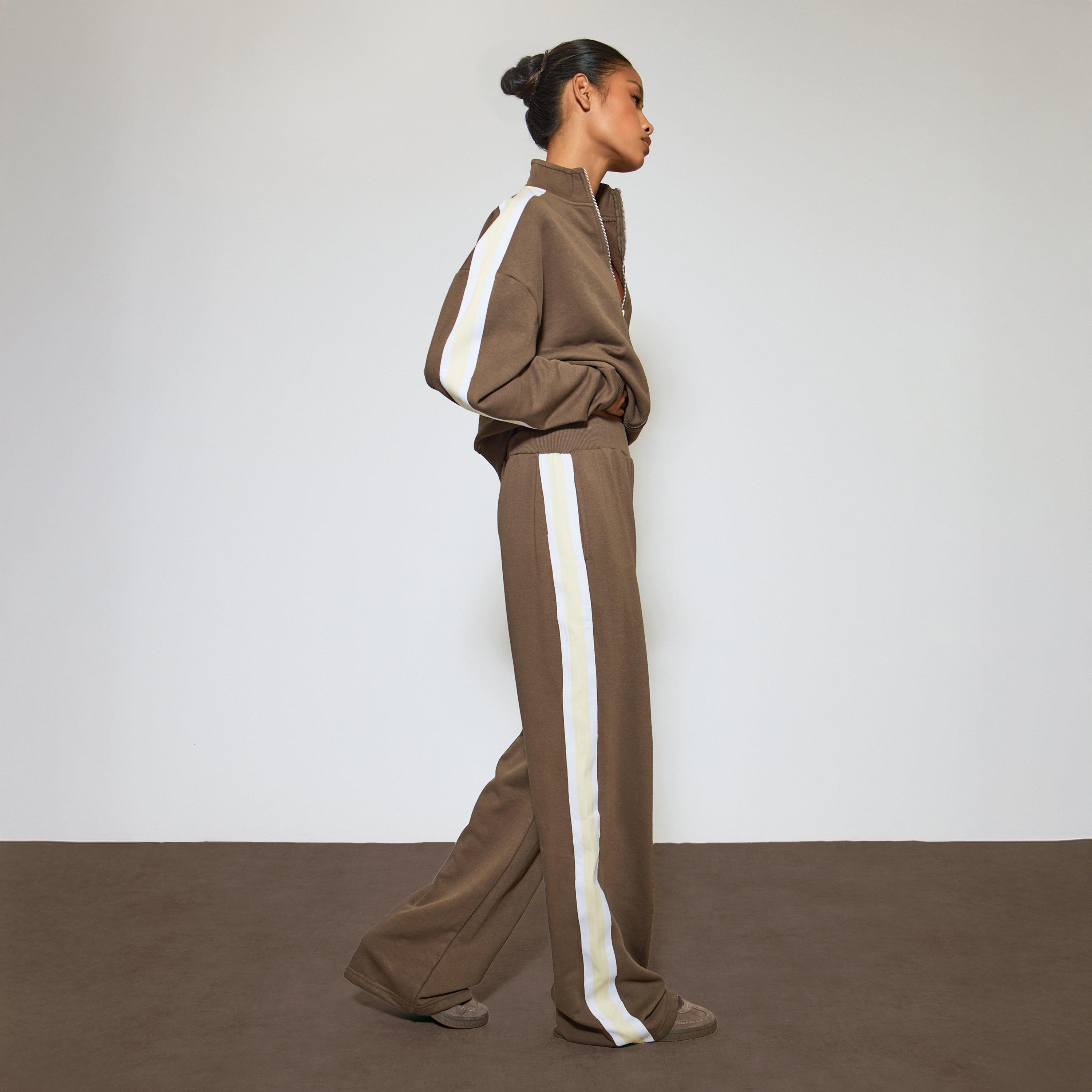 Upgrade your terminal style with these brown side stripe wide leg trousers, a piece that perfectly balances a relaxed fit with a sharp aesthetic. These joggers feature a mid-rise waist and a dramatic wide-leg cut, accented by a bold contrast stripe for a hit of retro-inspired energy. These brown side stripe wide leg trousers are an essential addition to your rotation of travel outfits, offering a lightweight feel that stays comfortable during long-haul flights. The chocolate hue provides a rich alternative to classic black, ensuring you look curated from check-in to arrival. Style these lounge bottoms with a matching zip-up hoodie and mini boots for the ultimate coordinated airport look. Key Features Chocolate Brown Fabric Contrast Side Stripe Detail Mid-Rise Elasticated Waist Wide-Leg Silhouette Soft-Touch Material