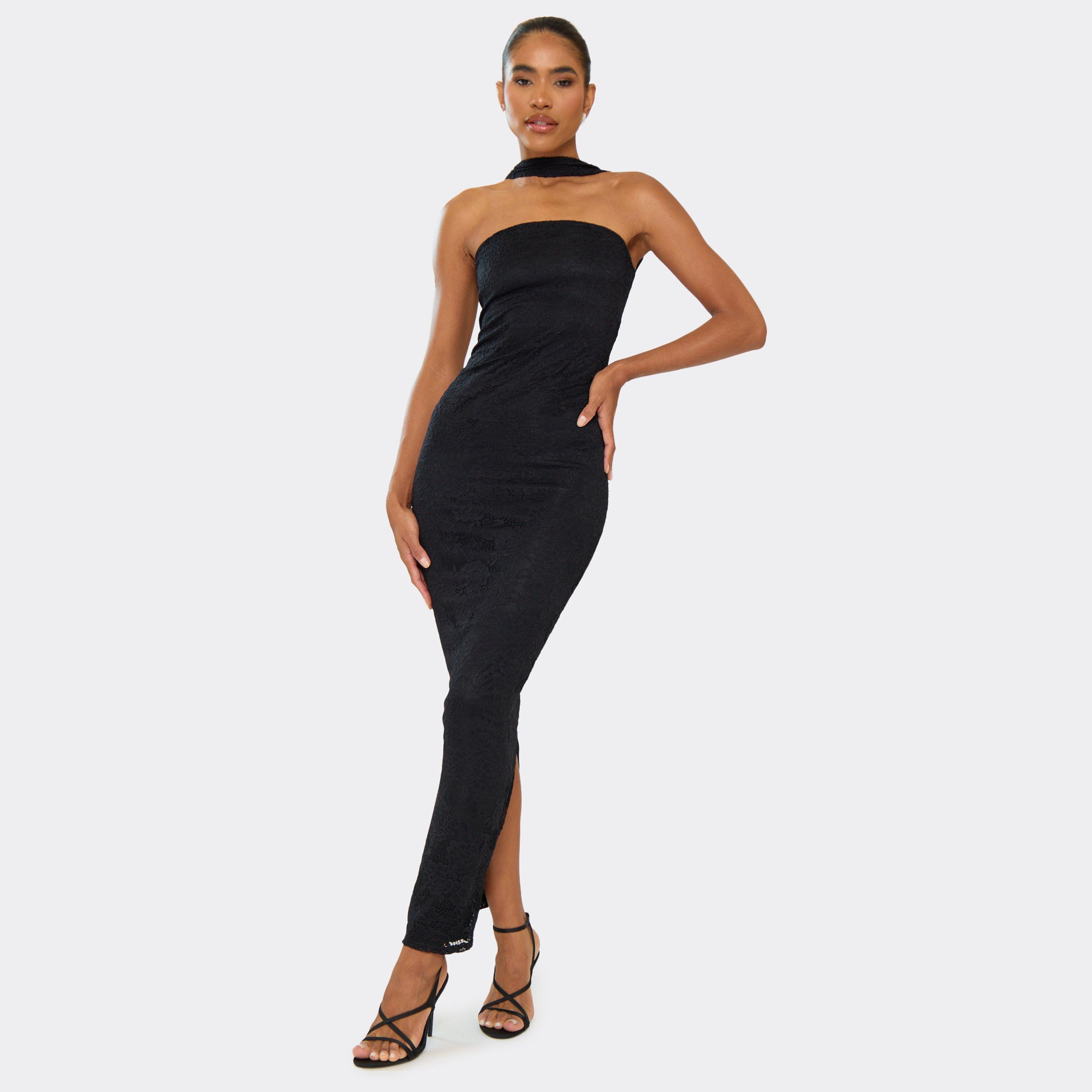 Perfect for evening events or dinner dates, featuring black lace material with scarf and midaxi-length detailing for a chic, it-girl finish.
